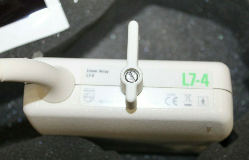 The Philips L7-4 ATL Linear Array Ultrasound Transducer is a high-resolution probe compatible with Philips HDI 3000 and HDI 5000 ultrasound systems, designed to deliver detailed imaging for various clinical applications. With a frequency range of 4-7 MHz, the L7-4 probe is ideal for superficial imaging tasks, including vascular, musculoskeletal, small parts, and thyroid exams, offering excellent clarity for examining finer anatomical structures.