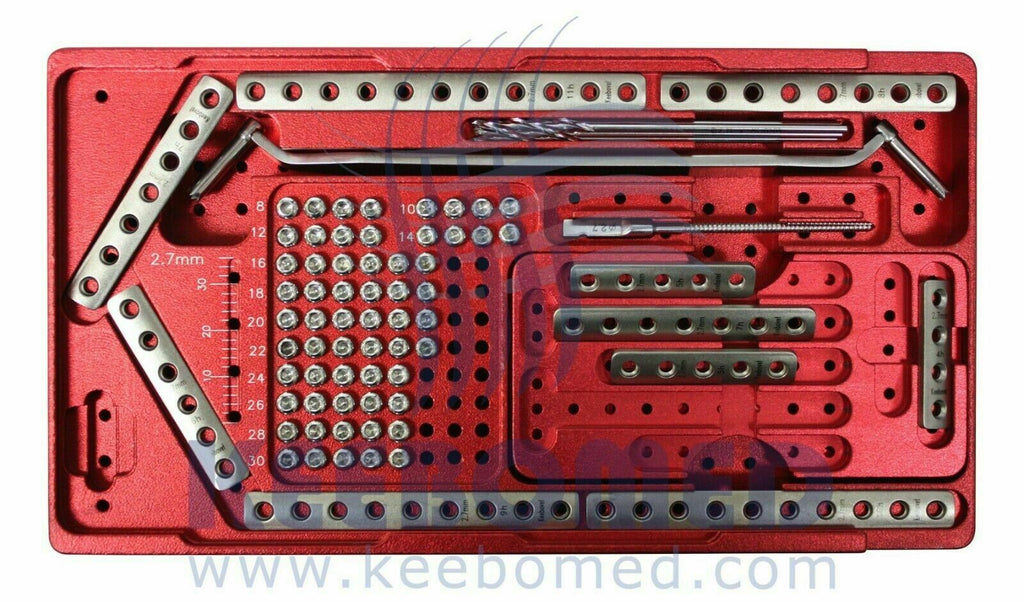 KeeboVet Micro Upgraded System has sizes 1.5mm, 2.0mm, and 2.7mm instruments and implants. This is a complete system that features stainless steel plates, self-tapping screws, and instruments.