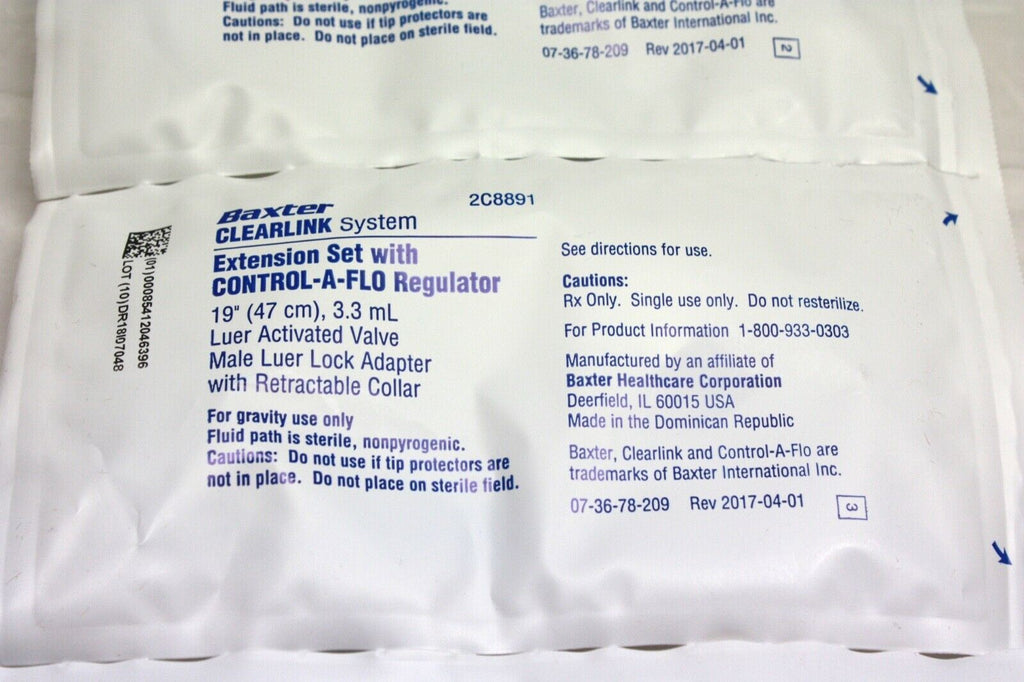 Extension Set with CONTROL-A-FLO Regulator and a CLEARLINK Luer Activated Valve and Male Luer Lock Adapter with Retractable Collar. Approximate Volume 3.3 mL. Approximate Length 19" (47 cm). Contains DEHP. The fluid path is sterile, Nonpyrogenic.